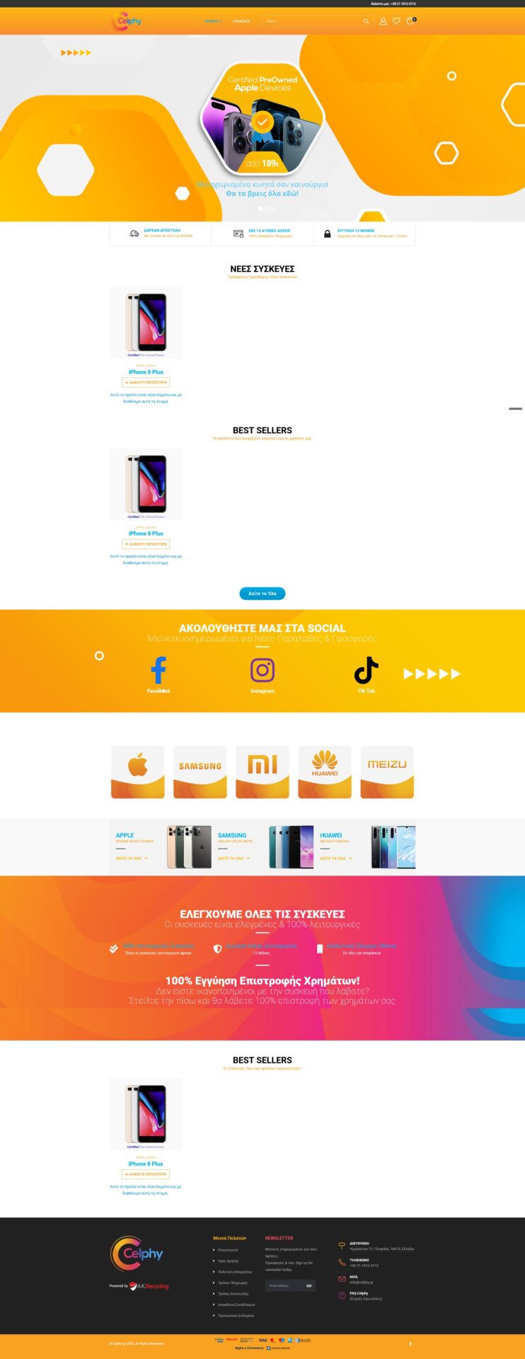 The three homepage hero slides — “Μεταχειρισμένα κινητά σαν καινούργια” (Refurbished phones like new), “3 interest-free instalments & 12 months guarantee”, and “FREE nationwide delivery” — were designed as a deliberate three-part trust sequence. Each slide addresses a different purchase objection in order: quality anxiety, financial risk, and logistics friction. The Slider Revolution hero was treated as a conversion funnel in visual form, not a simple promotional banner.