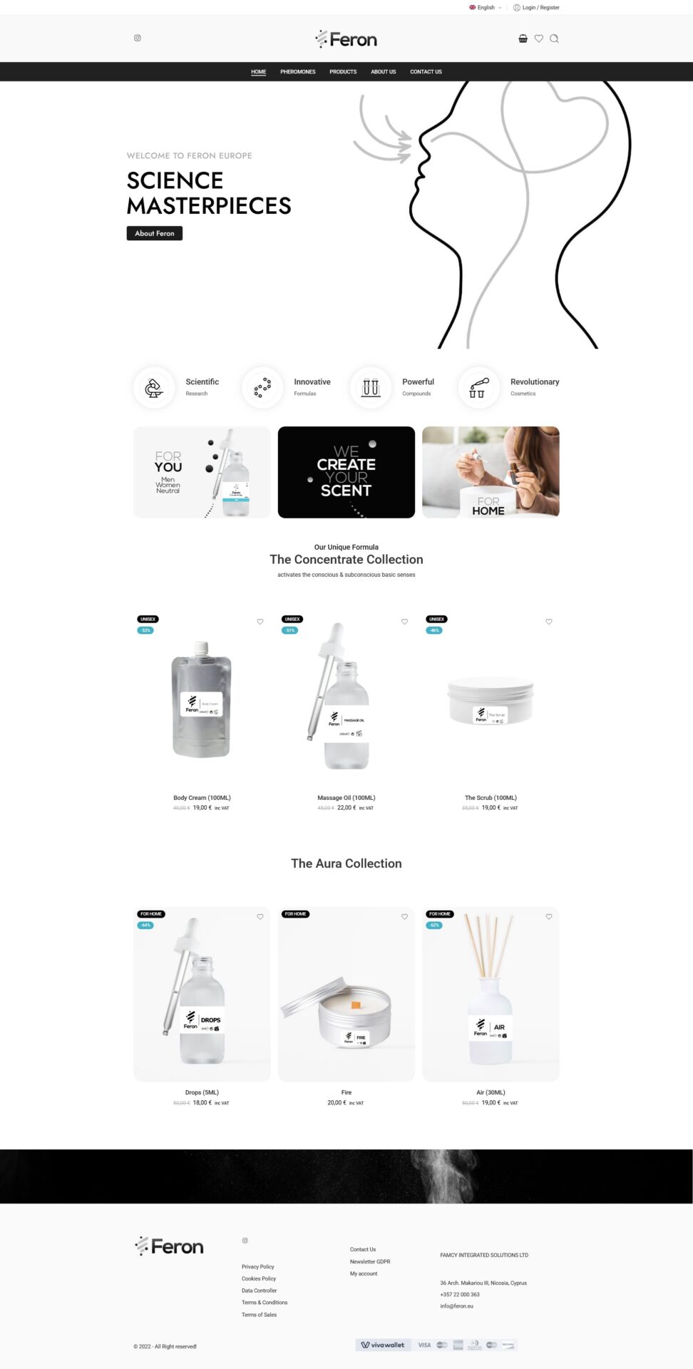 The central UX challenge was credibility. Feron’s product proposition — patented formulas that activate the conscious and subconscious senses — is genuinely novel and sits outside the conventions of standard cosmetics marketing. The design had to build trust before explaining the science, and explain the science before asking for a purchase. The information architecture reflects this: a dedicated Pheromones section addresses the category directly and pre-emptively, distinguishing Feron’s certified cosmetic formulas from unsubstantiated pheromone sprays and positioning the brand’s years of R&D as its core differentiator.