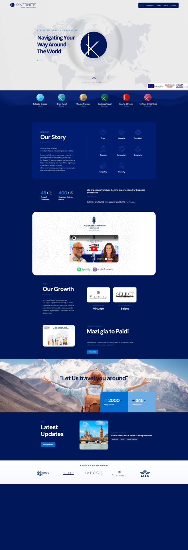 The core UX challenge was communicating the full range of Kyvernitis’s services — from maritime crew logistics to bespoke luxury leisure and international sports event management — without the site feeling sprawling or unfocused. The solution was a clear service architecture, where each division has its own dedicated section and landing page, all unified under a single navigation structure that makes the group’s scale legible at a glance.