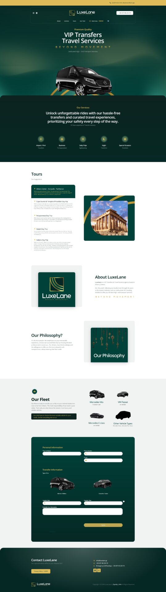 Fleet photography received careful treatment: each vehicle — the Mercedes Vito (9-seater), VW Passat, Mercedes E-Class, Mercedes V-Class, and bus options — was rendered or photographed consistently against dark backgrounds to match the site’s visual language. Tour destination imagery (Acropolis, Cape Sounio, Delphi, Nafplio, Peloponnese) was selected for atmospheric quality over stock-photo genericness — wide, golden-hour landscape shots that make the tours feel like curated experiences rather than day-trip packages.