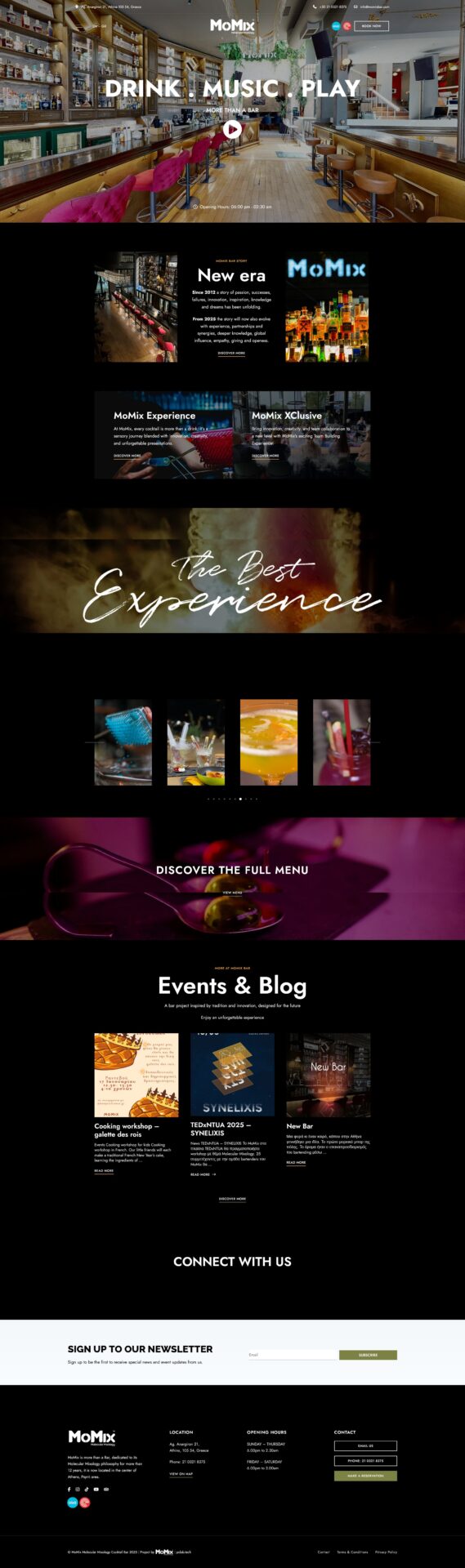 The site is bilingual — English and Greek — with full parallel content at momixbar.com (EN) and momixbar.gr (GR), serving both the international visitor market and the domestic Athenian audience. Delivery integrations with Wolt and e-food are surfaced prominently in the header navigation alongside the booking CTA, acknowledging that a meaningful share of MoMix’s revenue now flows through delivery platforms following the bar’s evolution into an all-day food and cocktail concept. An active events and news blog keeps the site current, drives SEO, and supports the bar’s visible role in the wider Athens food-and-drink culture scene — including TEDxNTUA workshops and competition participations.